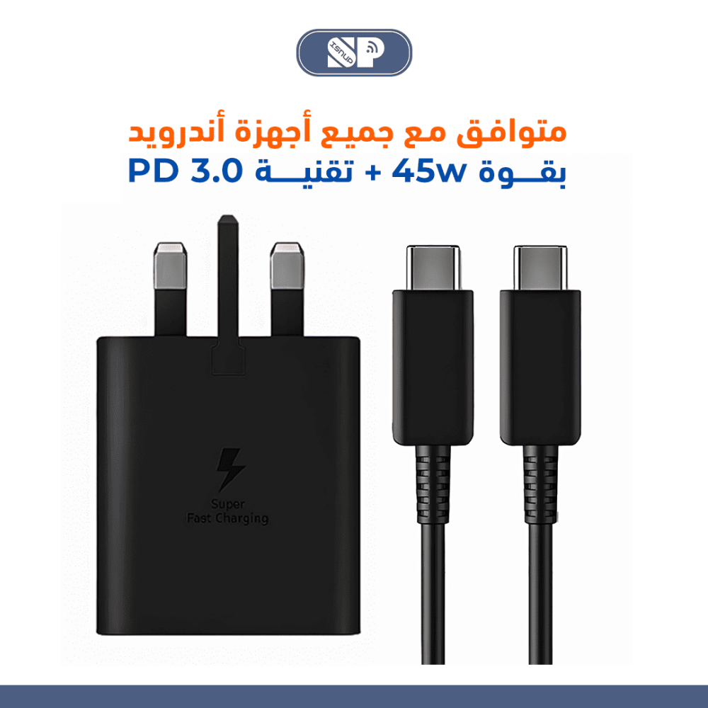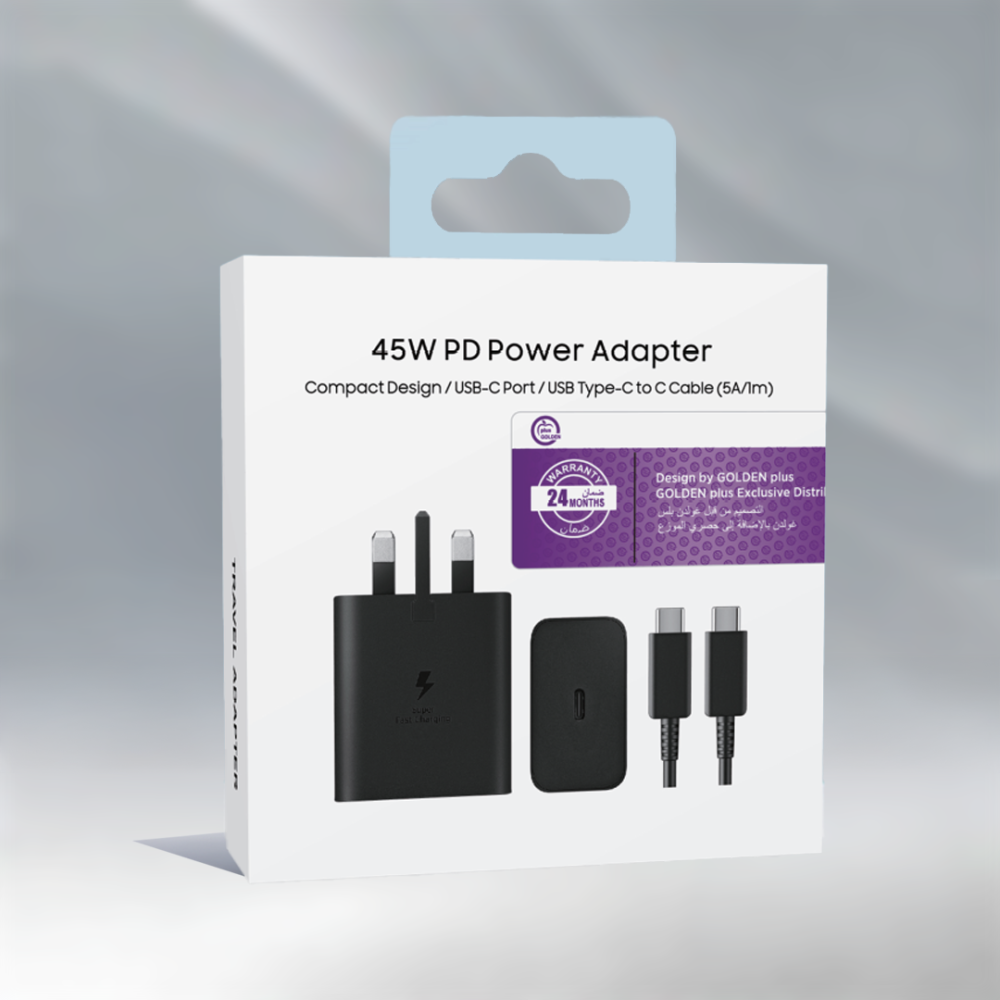 - اسم المنتج: شاحن سريع 45 واط لسامسونج جالاكسي مع كيبل شحن من النوع C بطول 1.2 ماركة جولدن بلاس